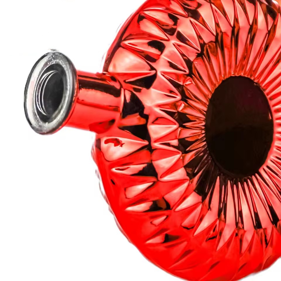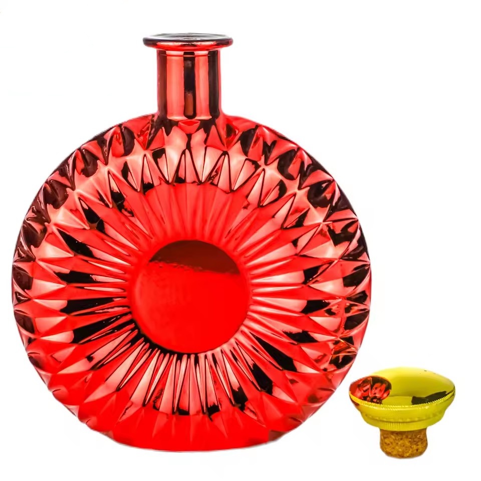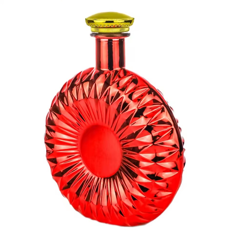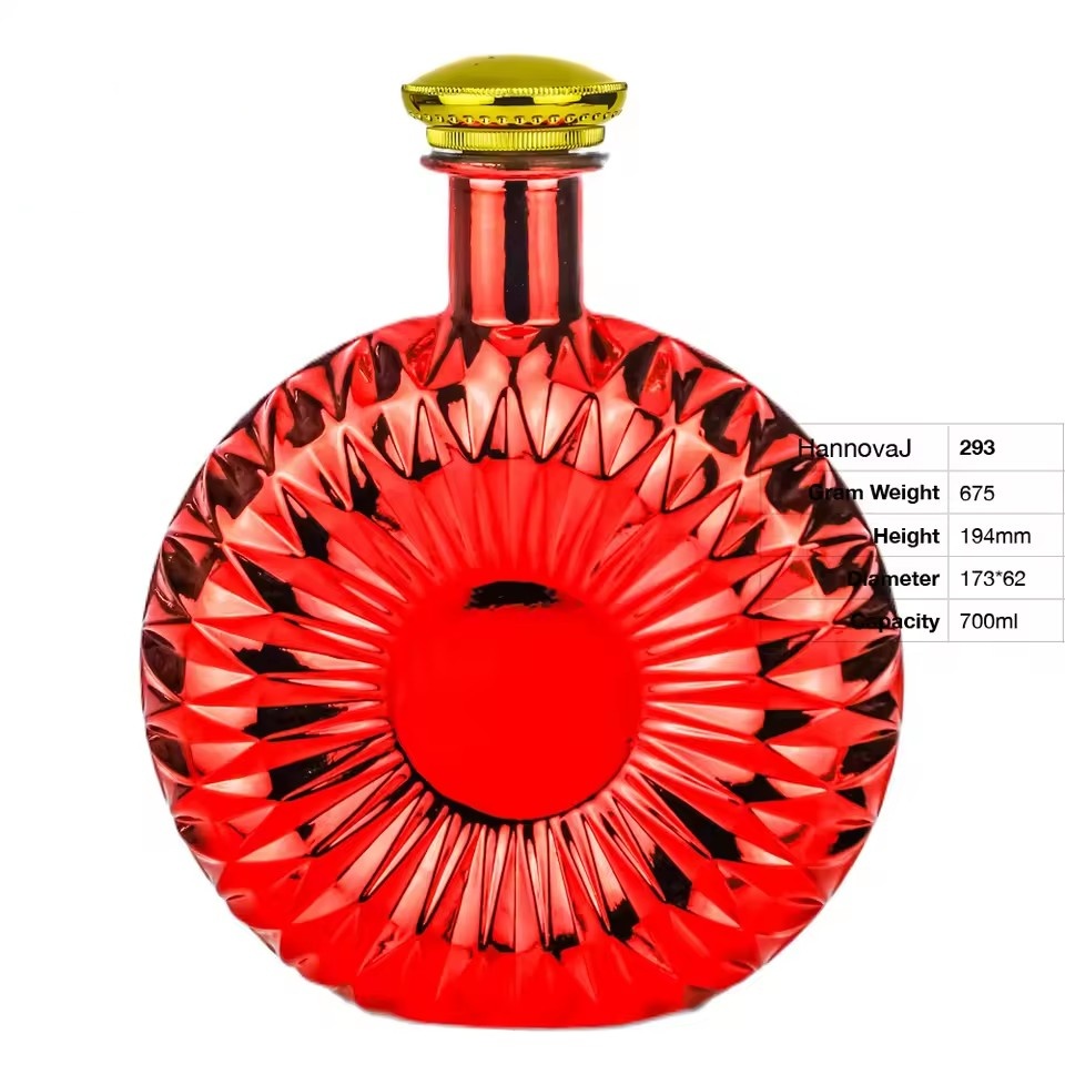 | Product: | Wholesale 700ml Custom Red Electroplated Flat Round Glass Liquor Bottle for Premium Brandy Gin Whiskey Vodka Spirits Packaging |