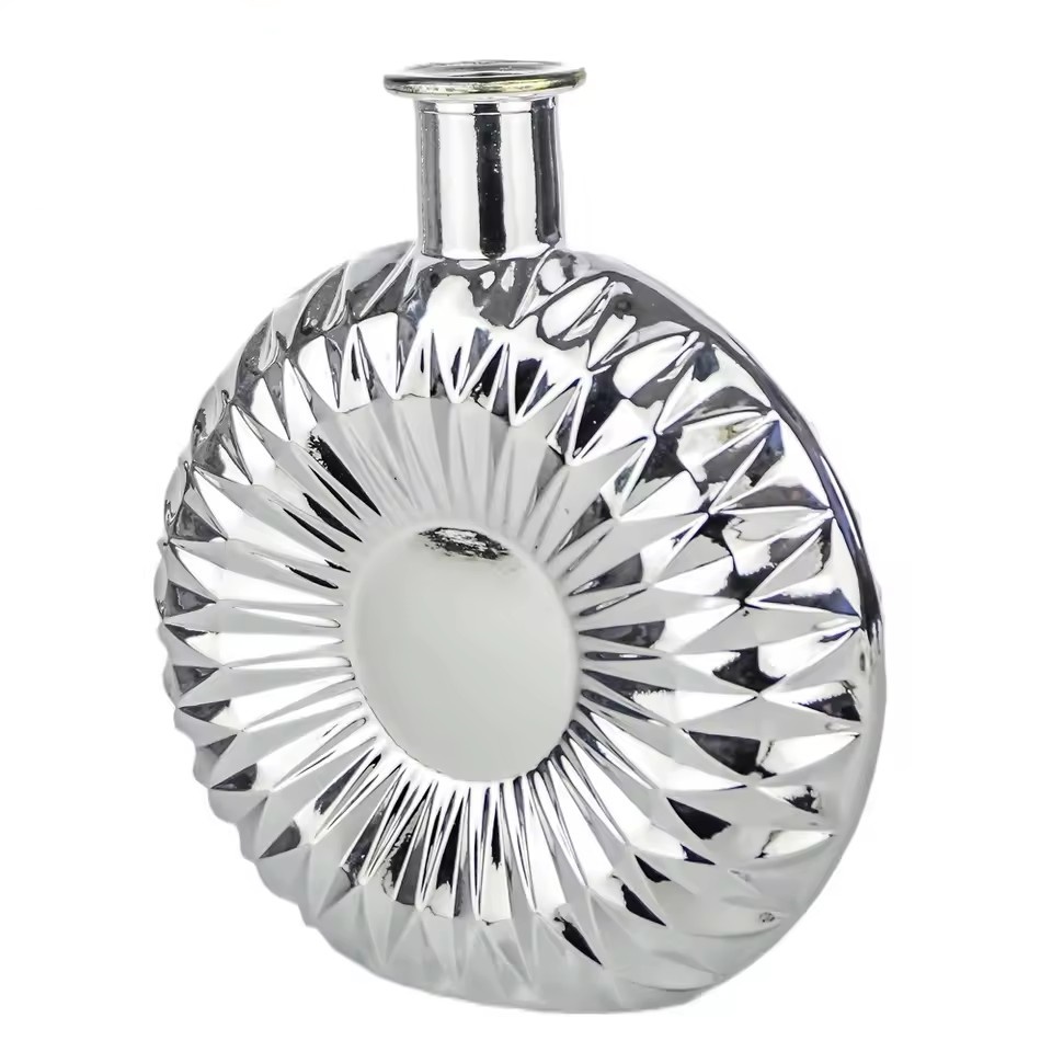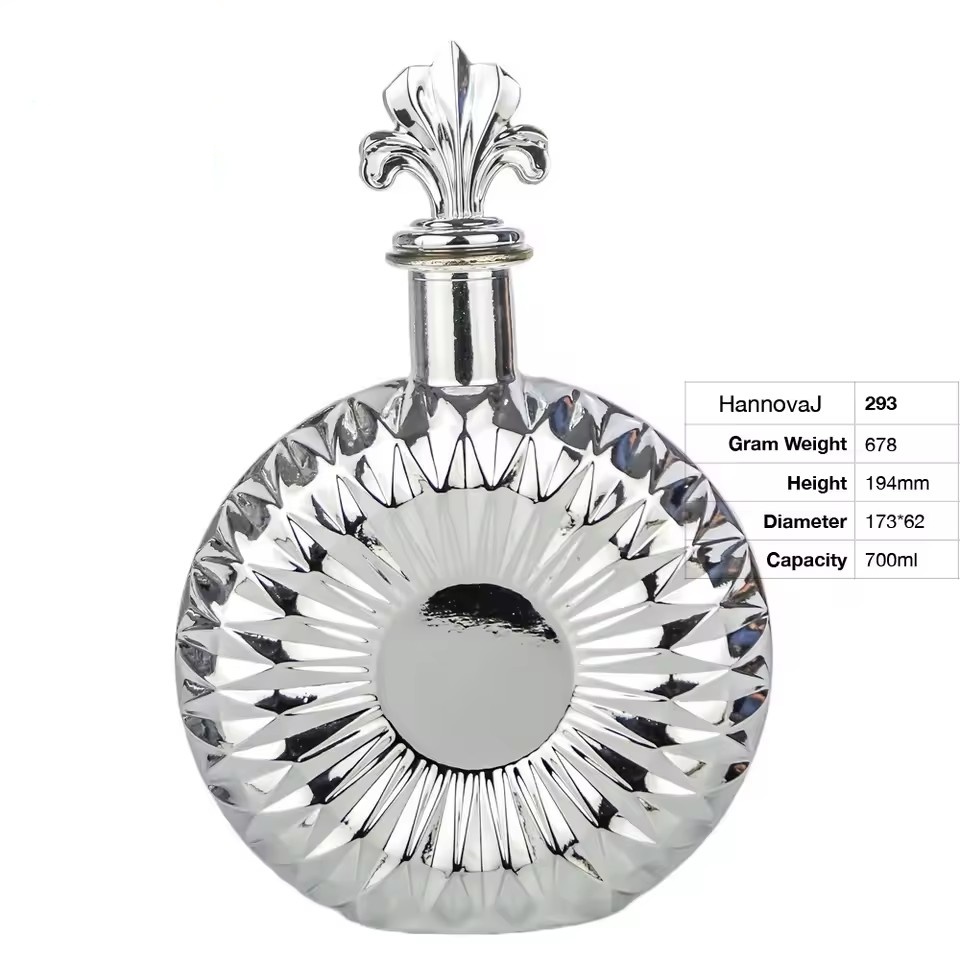 | Product: | Wholesale Luxury 700ml Silver Electroplated Flat-round for Vodka Brandy Custom Empty Spirit Bottle With Fleur-de-lis Stopper |