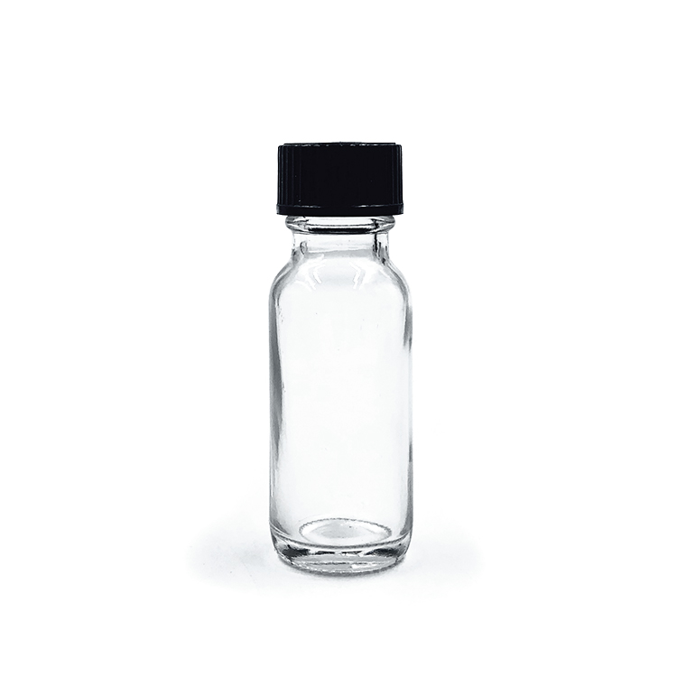 | Product Name : | 1/2 Ounce 15ml clear boston round glass bottles with black poly seal cone cap |