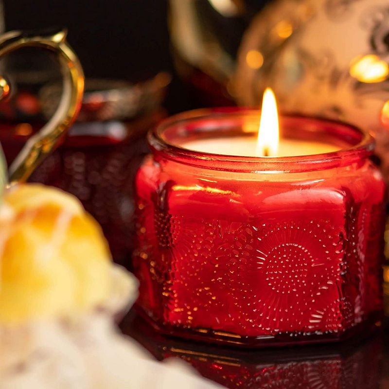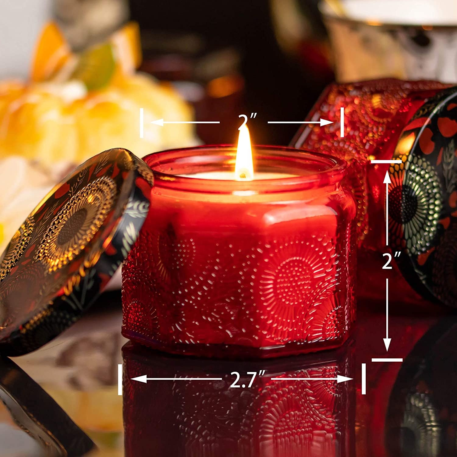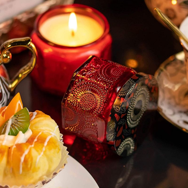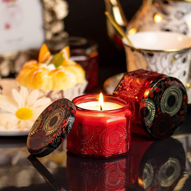 | Product | 2021 New popular 4oz high quality red retro embossed glass candle container with Lid wedding party candle jar |