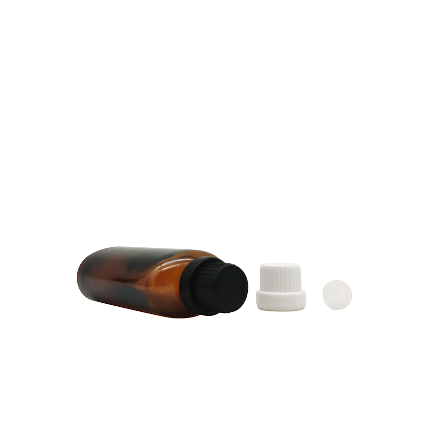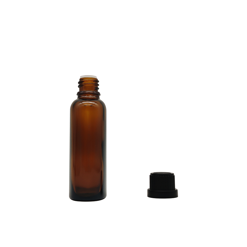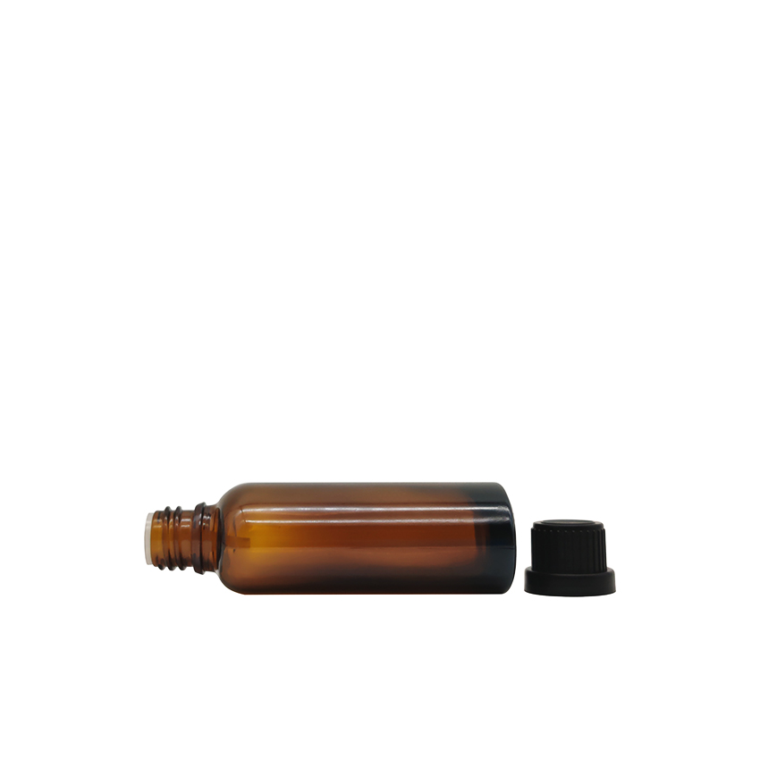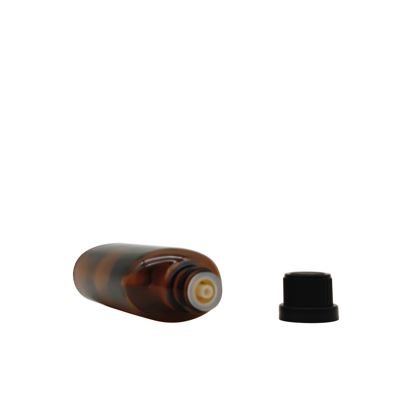 20ml Flat Amber Empty Essential Oil Glass Bottle With Child Protection Cap And Inner Stopper |