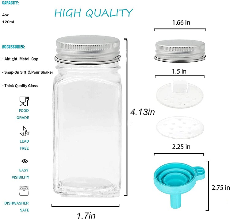 | Product: | Glass Spice Jars with Labels,4oz Empty Square Spice Bottles condiment containers with Shaker Lids, Airtight Metal Caps and Silicone Collapsible Funnel |