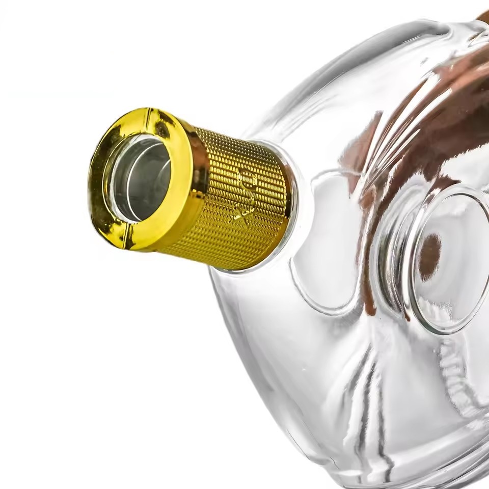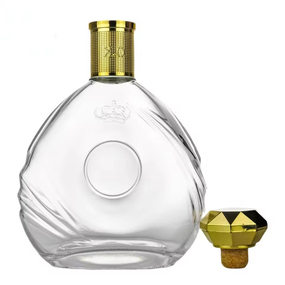 | Product: | Wholesale 700ml Ornate Flat Round Embossed Crown Bottle for XO Cognac Brandy with Luxury Gold Stopper Empty Spirit Glass Bottle |