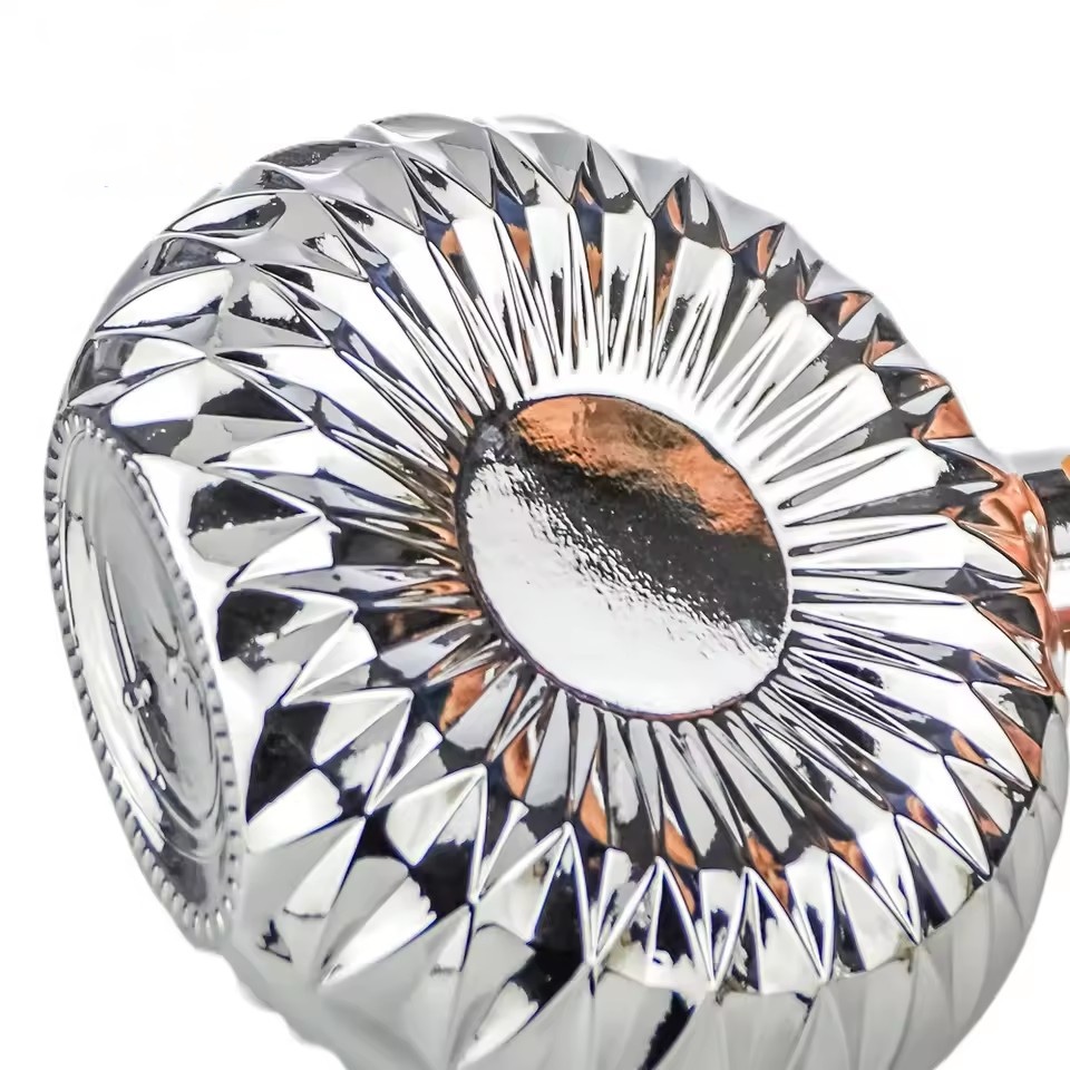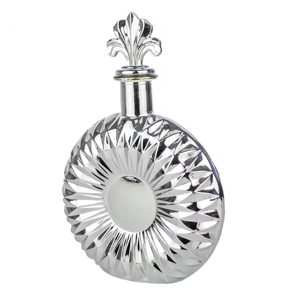 | Product: | Wholesale Luxury 700ml Silver Electroplated Flat-round for Vodka Brandy Custom Empty Spirit Bottle With Fleur-de-lis Stopper |