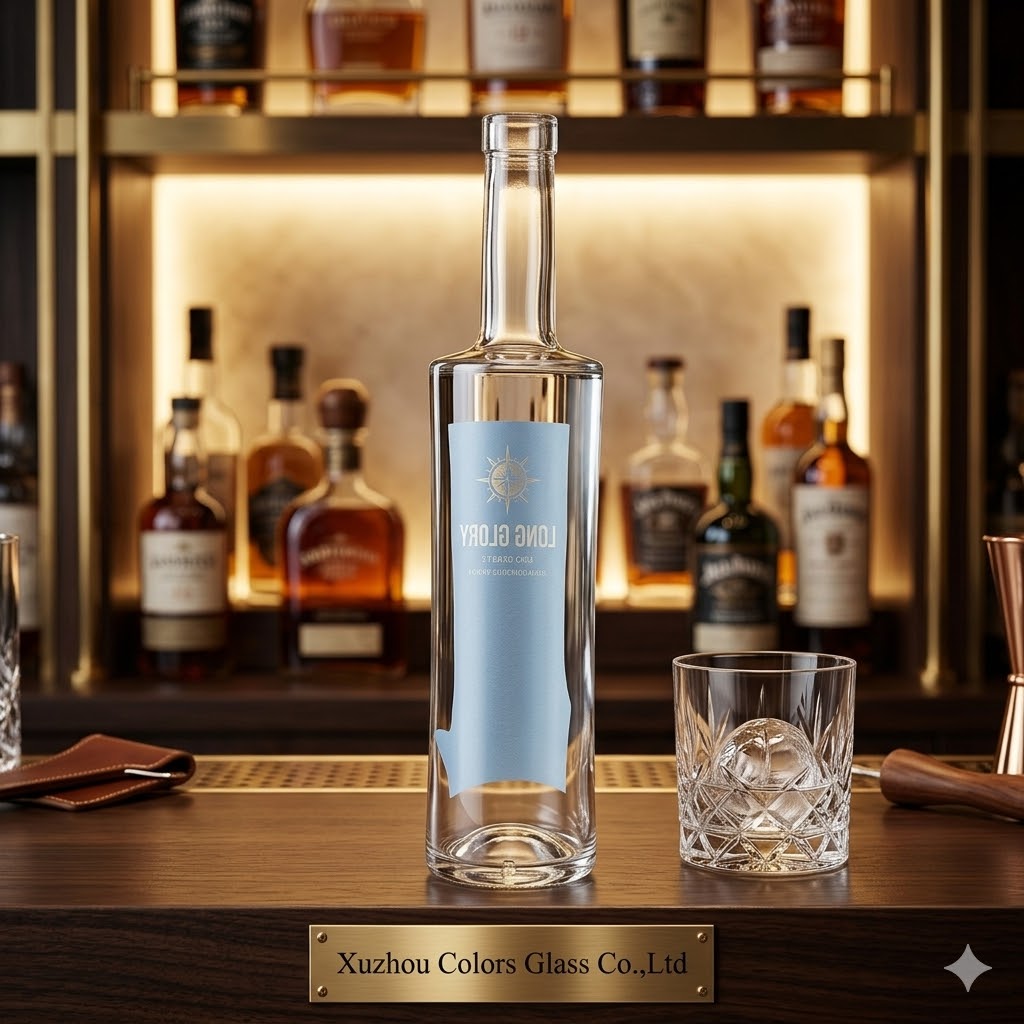 These custom glass liquor bottles are available in 500ml, 700ml and 750ml, designed for premium spirits packaging including whisky, vodka, gin, rum and brandy.